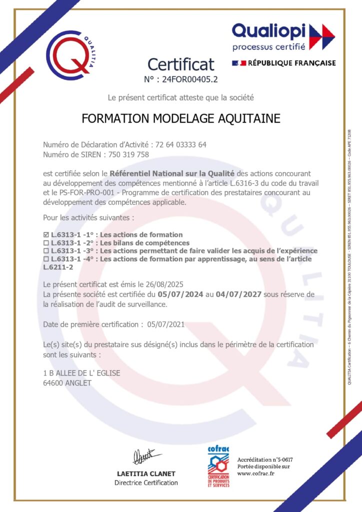 FORMATION MODELAGE AQUITAINE est référencé DATADOCK depuis le 19 Juin 2017, et QUALIOPI (Certificat N° 201161.1) depuis le 5 Juillet 2021, un impératif pour notre organisme d’être en adéquation avec la réforme de la formation, de répondre totalement aux 21 critères qualitatifs, gage de savoir faire. Notre audit de surveillance a eu lieu le 21 novembre 2022. Ce référencement vient s’ajouter à celui du Carif/Oref, ainsi qu’à la subrogation de paiement avec les organismes suivants : FAFCEA – OPCO EP – CONSEIL REGIONAL.